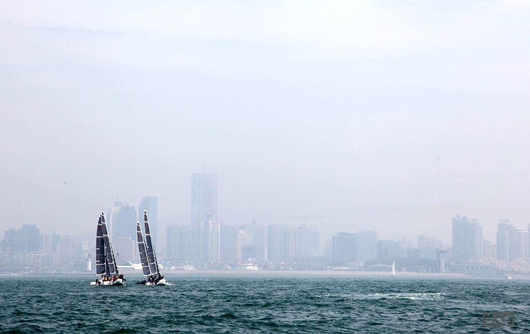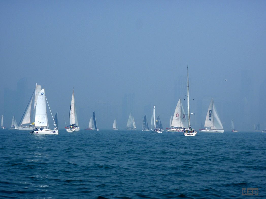 | 2 Minuten. Ich lasse die Segel dicht holen und wir steuern in Richtung Startlinie. 1 Minute. Frederick ist vorne an der Fock und hält nach einer Lücke im Startpulk Ausschau. Da! Wir stechen mit voller Geschwindigkeit ins Feld und in Richtung Startlinie. Platz zum manövrieren ist nicht mehr. Schreie nach Lee “Rauuuuum”. Drängeln nach Luv. 4.3.2.1. Los. Wir sind Punktgenau and er Startlinie und kommen so an Platz 5 weg. Ein paar Wenden nach Luv. Wo ist die Boje? Es hat Smog in Qingdao und die Sicht ist sehr eingeschränkt. Wir verfolgen das erste Boot und sehen es Halsen. Da muss die Boje sein. |