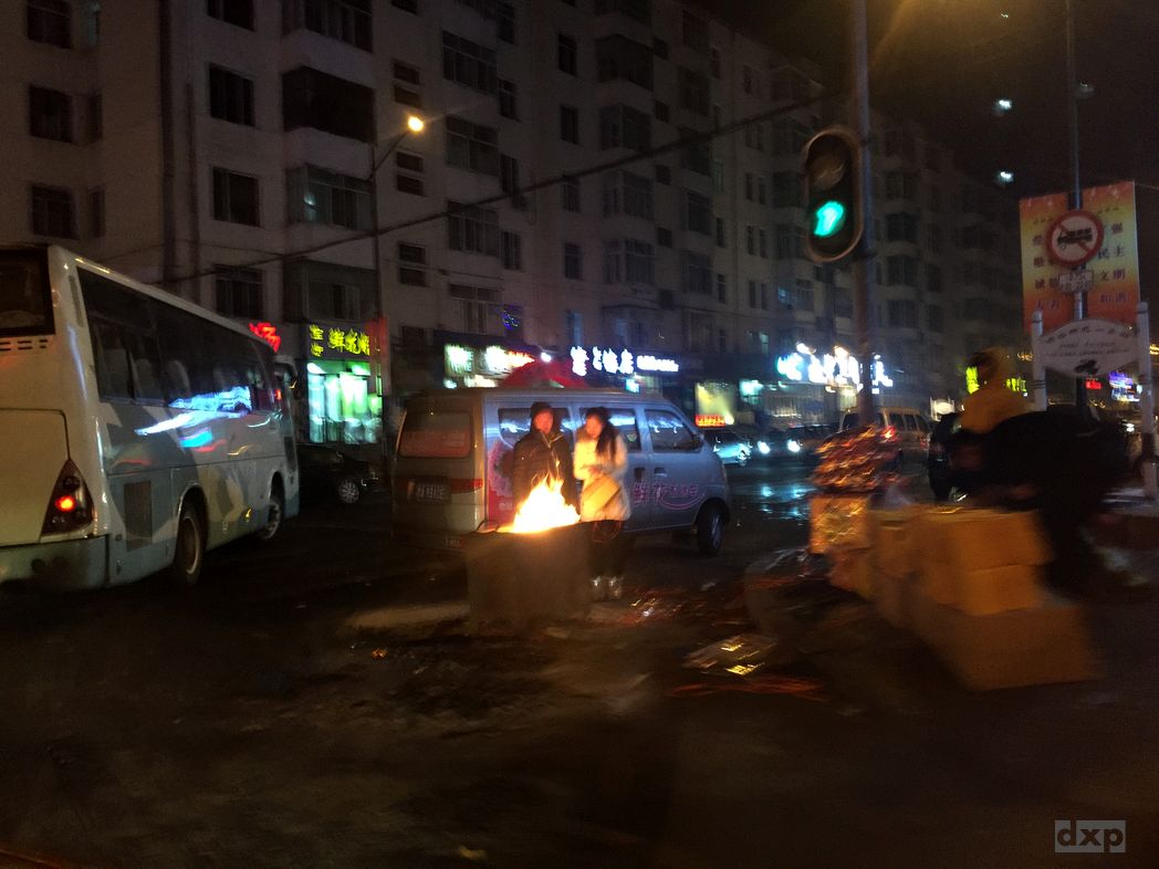 Minus 30 Grad hat es, als ich aus dem Flieger in den Flughafenbus stieg. Leider hatte der Flieger knapp 4 Stunden Verspätung (was fast völlig normal ist in China). Taxis gab es spät in der Nacht kaum welche (der Flughafen ist ca. 30km von der Stadt entfernt) und die wenigen waren vorbestellt. Drei Chinesen haben mich dann netterweise mit in die Stadt genommen. Das Hotel war klein und nett. Noch ein Ankommer-Bier und dann ins Bett.