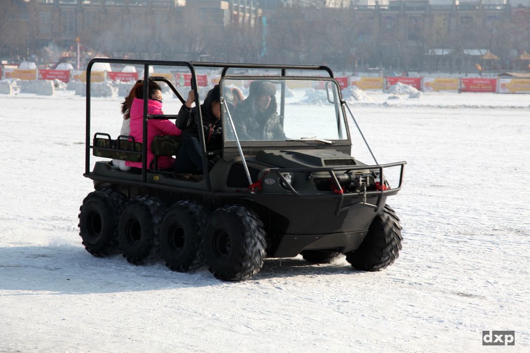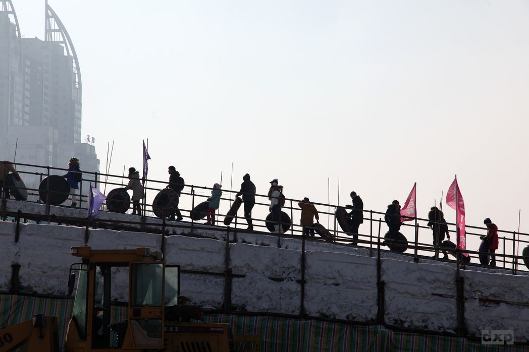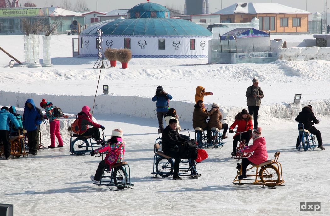 Die Größe der “Skulpturen”, filigrane Kunst bis mehrstöckige Gebäude, beeindruckt genauso wie die Erkenntnis, dass hier ein ganzes Drof aus Eis aufgebaut wurde. Was eine Arbeit! Trotz Sonnenschein hat es -27 Grad. Brrrrrr. So lange man sich bewegt ist alles OK. Sobald man stehen bleibt werden die Füße kalt. Den Chinesen scheint das nicht ganz so viel aus zu machen, die Stöckelschuhe einiger Damen isolieren sicher gut. Typisch China, ist das Ganze ein Spass für die ganze Familie. Eisrutschen, Eisrad fahren, Schlauch rutschen, Eislaufen, Panzer- und Schlitten fahren genauso wie laute Musik gehören halt dazu.