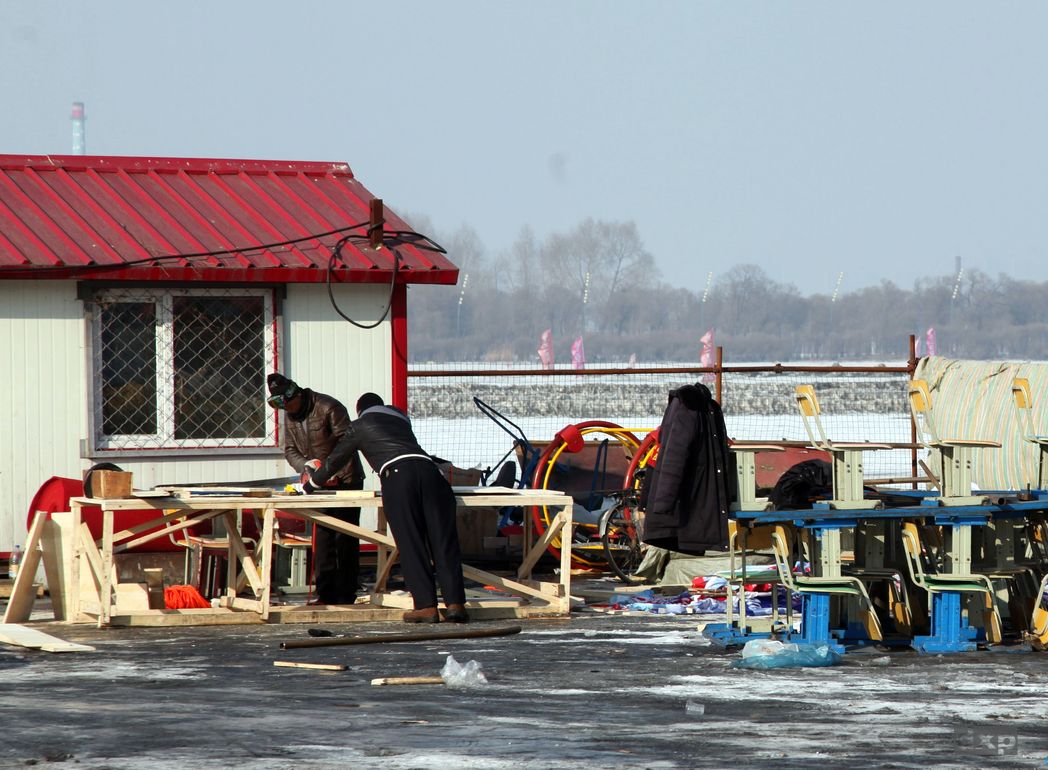 Die Regierung hat wohl für die Region ordentliche Heizungen vorgegeben. Kuschelig warm ist es im Zimmer. Ich sitze im T-Shirt beim Frühstück, um durch das Fenster vermummte Gestalten auf den Gehsteigen zu beobachten. Chinesisches Frühstück mit Seealgen, Reis und Teigtaschen. Um 09:00 mache ich mich auf zum Festival, einem grossen Gelaende auf Sun Island am anderen Flussufer.