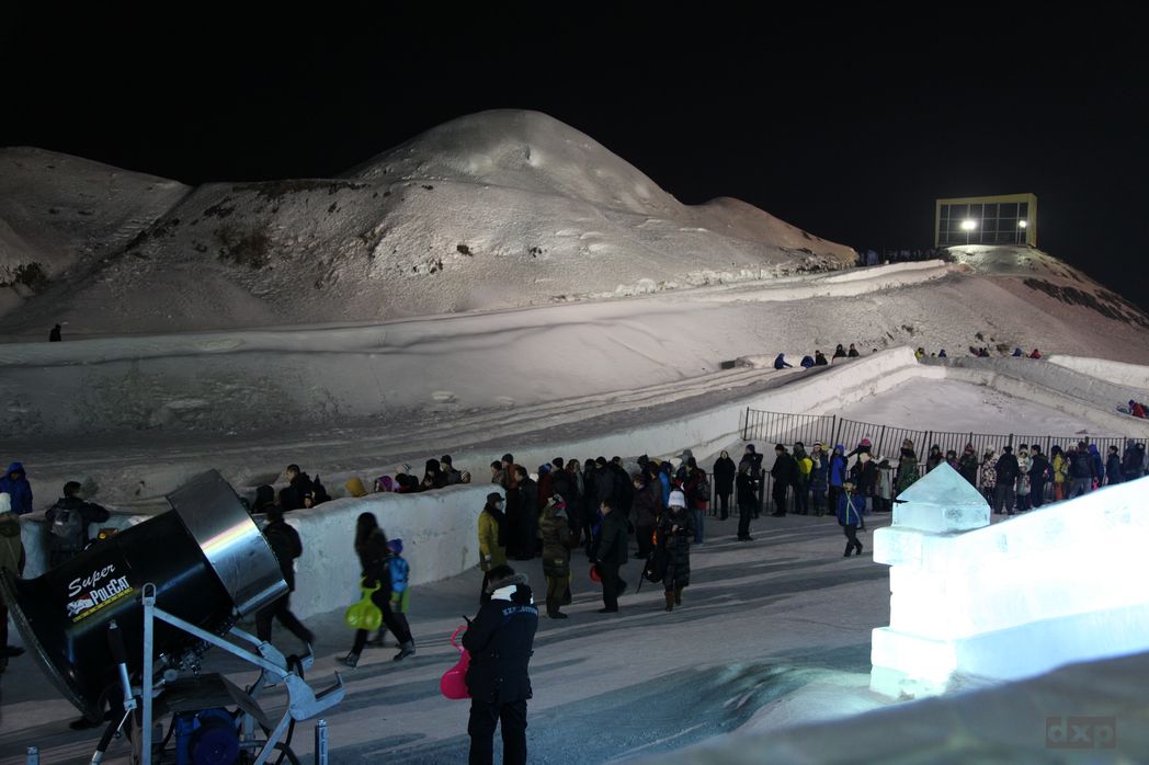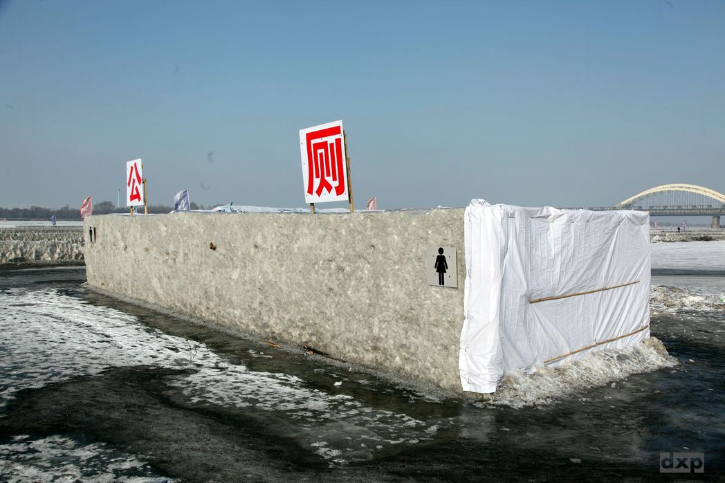 Am späten Nachmittag mache ich mich noch mal auf den 10km Weg zum Snow & Ice Festival. Zu Fuß geht es über den zugefrorenen Fluss. Am Ufer eine “Party Meile” mit Attraktionen und Aktivitäten. Pferdeschlitten fahren, Reifen rutschen, Schlittschuh laufen. Sogar die Toiletten sind aus Eis. Einen Abfluss gibt es bei der Kälte nicht, und so wird der “Mist” dann weg geschaufelt. Praktisch.