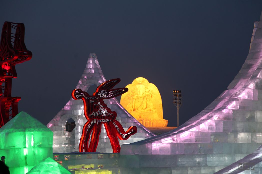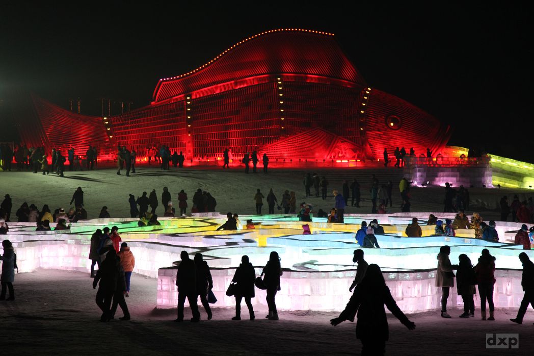 Mit den Lichtern ist das jetzt erst recht Beeindruckend. LEDs beleuchten die Gebäude und Skulpturen von innen und außen, wechseln durch alle Regenbogenfarben. Es gibt warmen Tee und Süßigkeiten. Musik spielt. Staunen und Schauen. Winterwunderland in China!