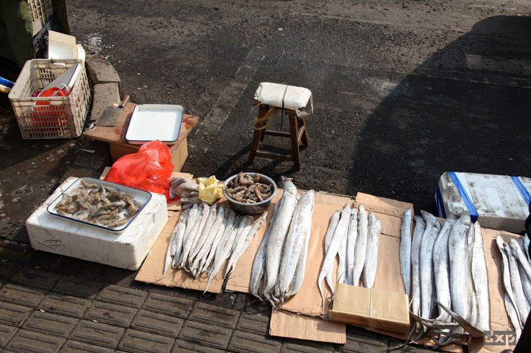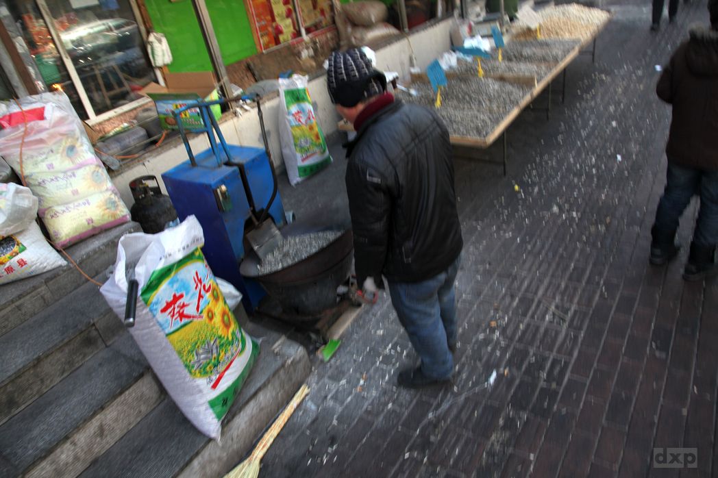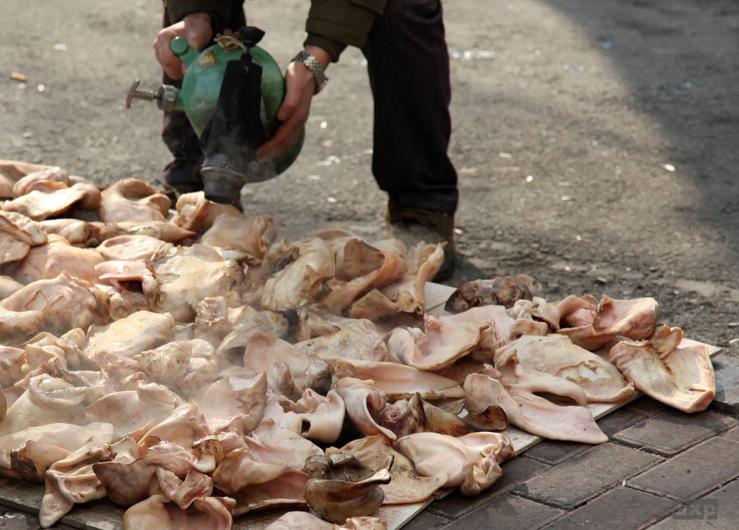 An allen Ecken und Enden gibt es Essen zu kaufen. Aus kleinen Läden wir auf die Straße verkauft. Es dampft und raucht aus den Fenstern. Spieße mit Fleisch oder Tintenfisch, gegrillt, scheint das Hauptnahrungsmittel zu sein. Die Straßenhändler bieten Nüsse in allen Varianten an. An einer Ecke brennt der Metzger auf der Straße die Haare von Schweinsohren. Fische, Gemüse, Obst liegen aus, sind natürlicherweise tiefgefroren.