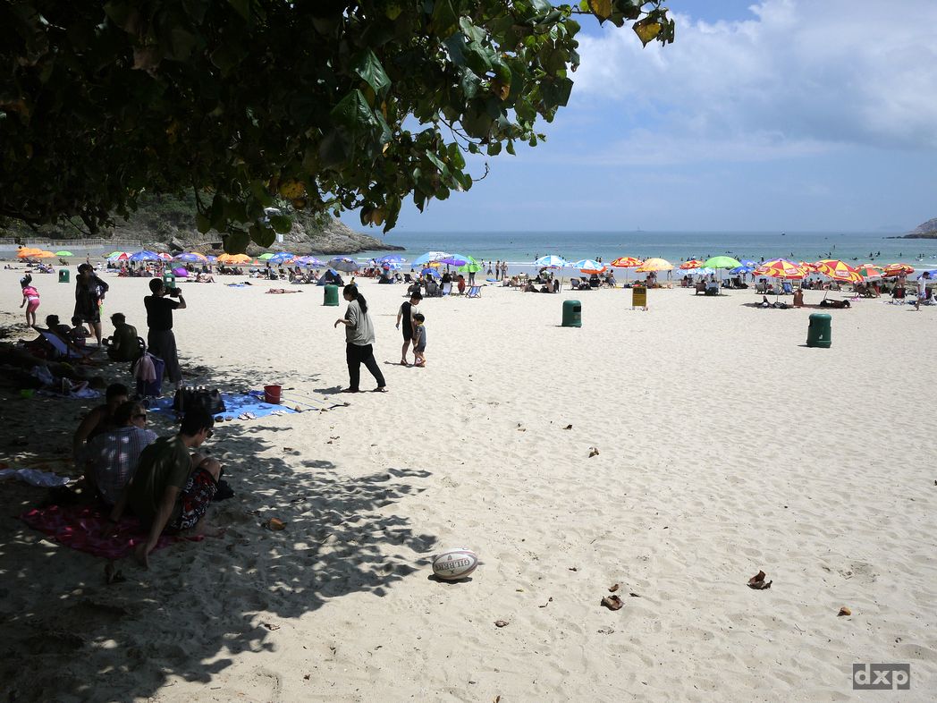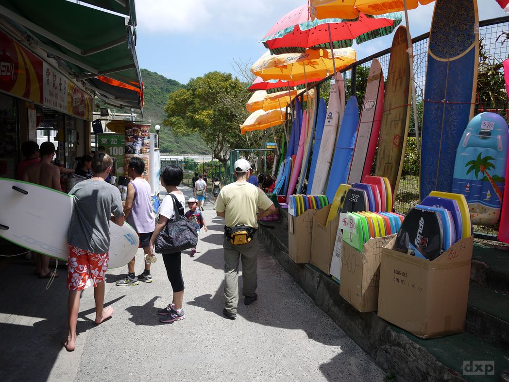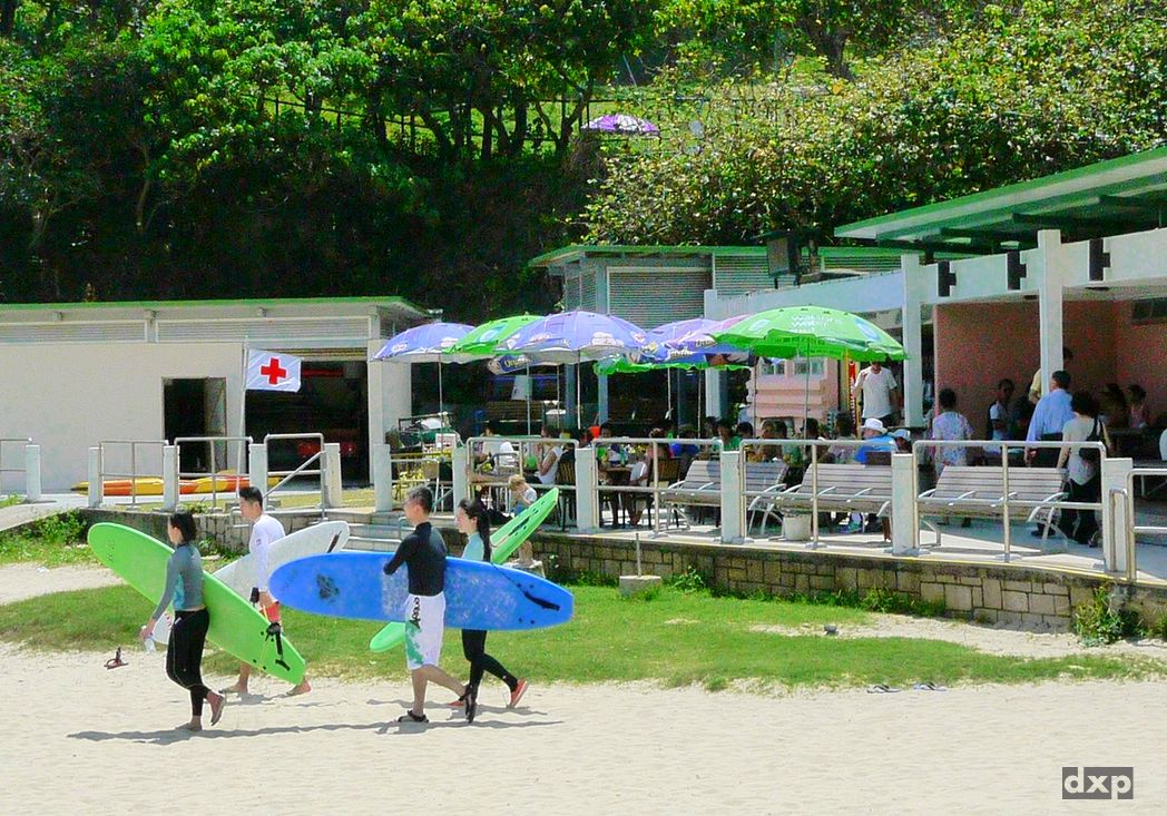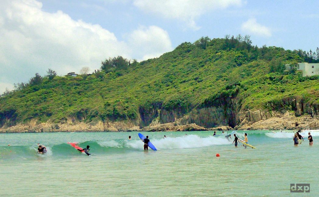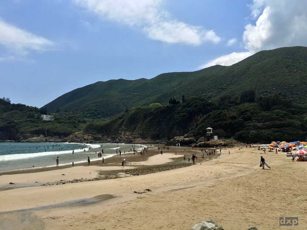 Von Wan Cham Shan führt der Pfad angenehm schattig aber steil hinunter nach Tai Long Wa, der Big Wave Bay. Trubel in der kleinen Bucht. Surfboards sind zu leihen und ein paar Restaurants gibt es. Ich kühle meine Füße im Südchinesischen Meer und schaue den Surfern zu. Herrlich!