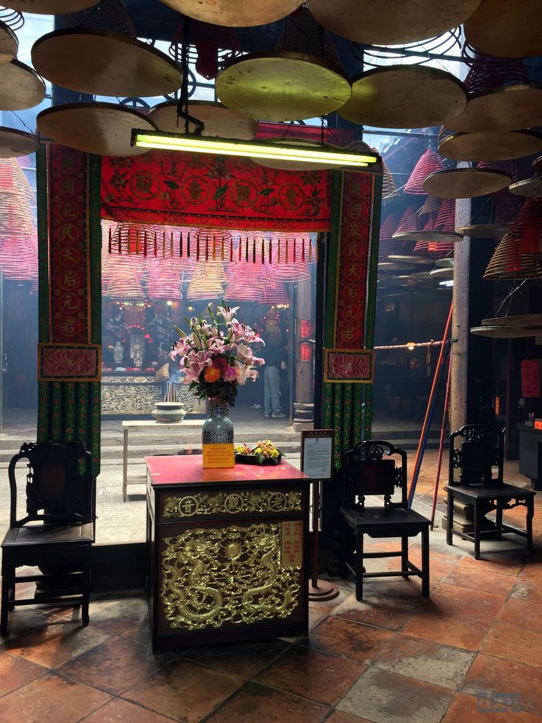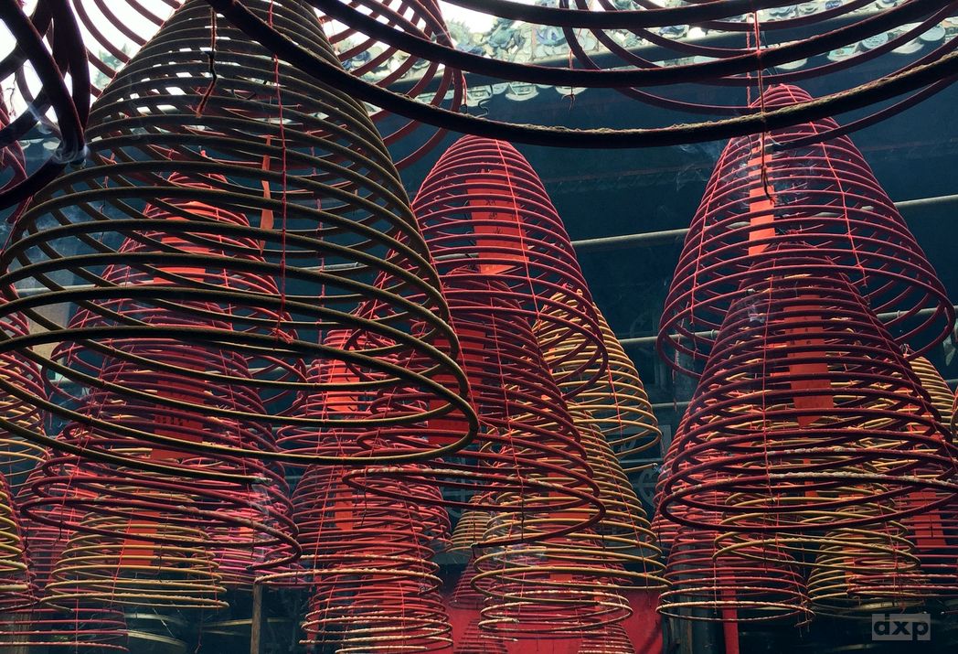 Dem Duft von Räucherstäbchen folgend entdecke ich den kleinen „Yau Ma Tei“ Tempel. Von der Decke hängen diese in dicken Spiralen, glühend und qualmend. In dem stickigen Nebel werden Opfergaben dargereicht und es wird gebetet. Alles wird gut!