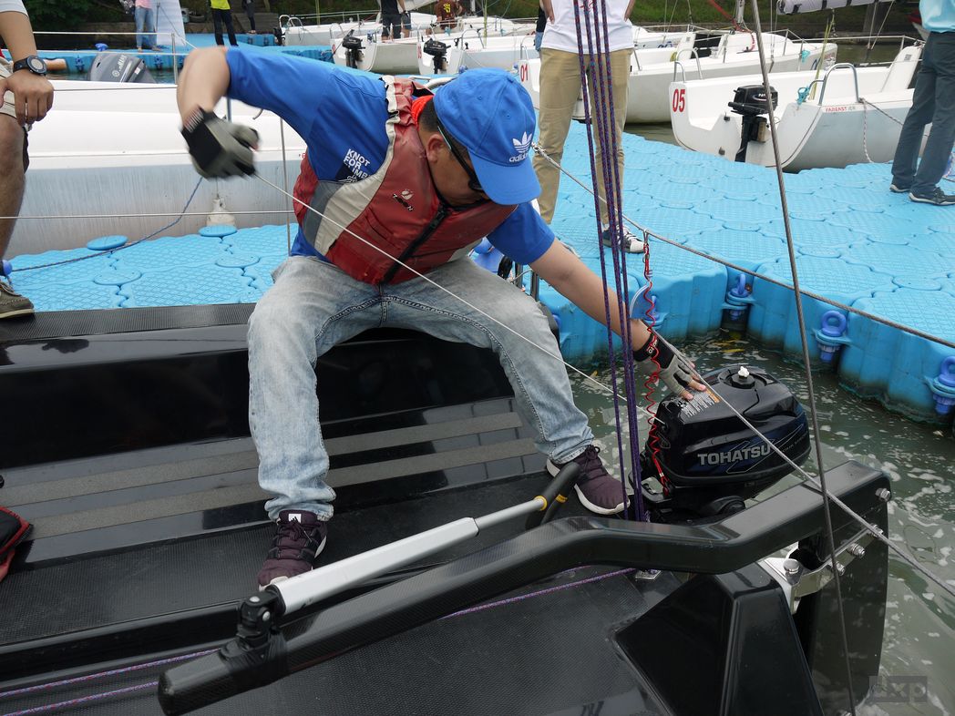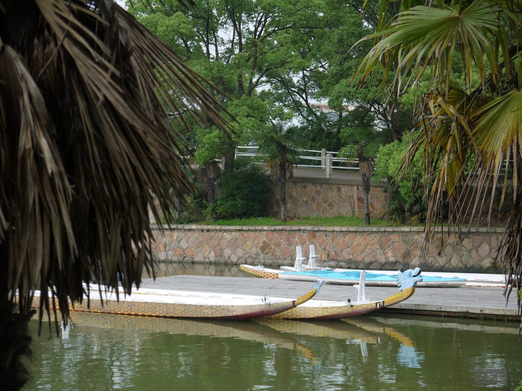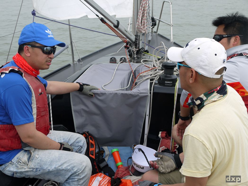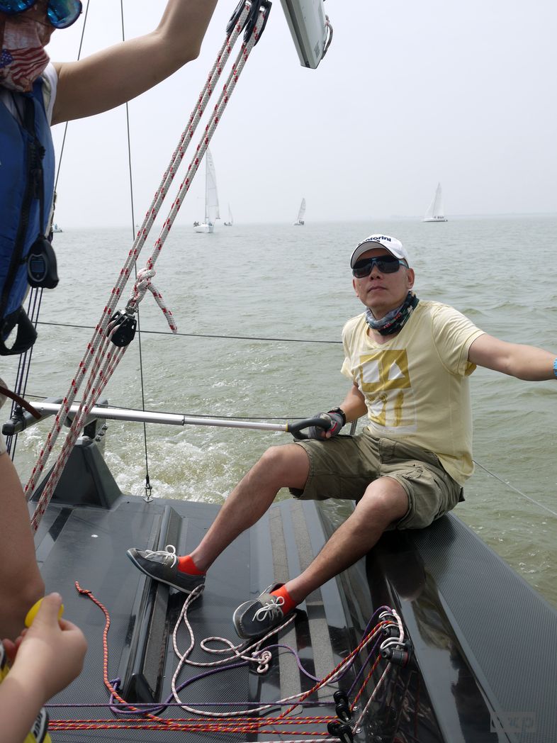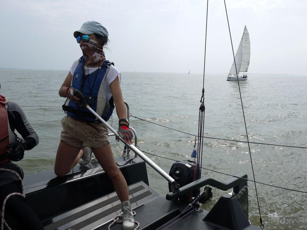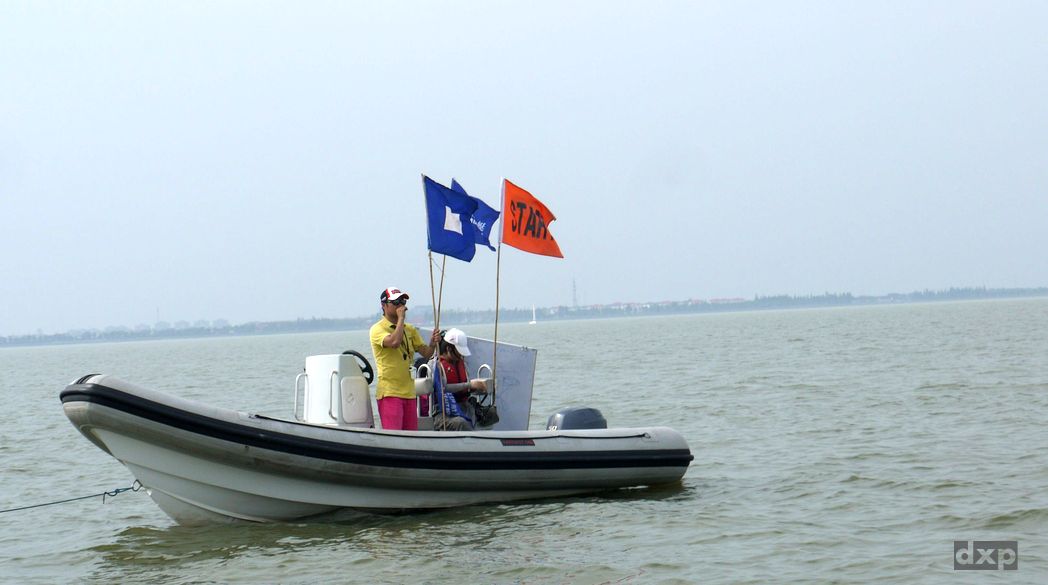 Trainingsregatta am Dianshan Lake. Um ein Uhr Mittags ist die Luft schwer und heiss, fliest regelrecht ueber den See. 32 Grad, kein Schatten auf dem Boot. Puh. Wir sind zu fuenft an Bord und noch zwei kleine Kinder. Nette Leute. Uns wurde die schwarze FR28 mit der Nummmer 77 zugelost. Sieht cool aus in schwarz.