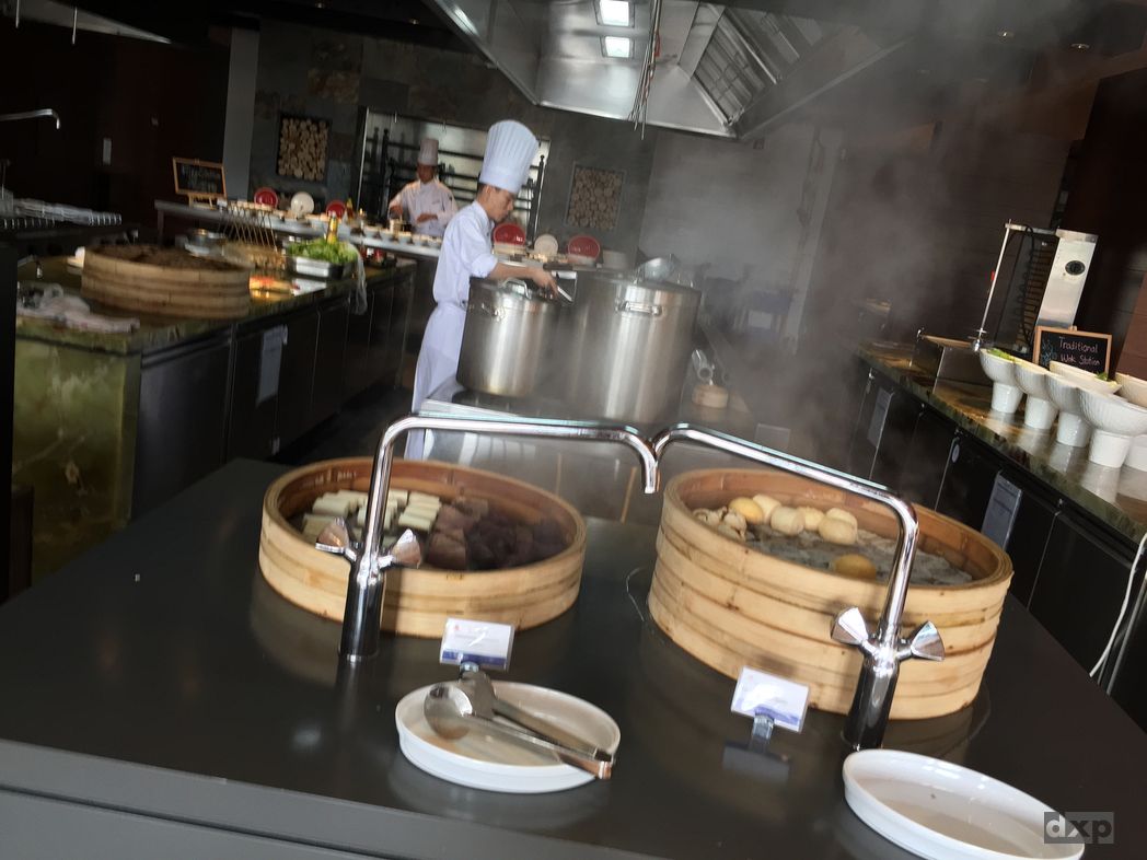 Weltmeisterlich wird der Frühstücksteller mit Leckereien beladen, durchaus höher als der Teller an Durchmesser hat. Dumpling, Nudeln, Obst, Reis, Kuchen, Ei, Waffeln und noch eine Kugel Eis oben drauf. Ja, das geht. Eine bestimmte Reihenfolge des Stapelns scheint dabei eher nebensächlich zu sein. Ich will das nicht verurteilen, vielleicht liegt es ja in der Chinesischen Kultur, Historie oder Etikette verborgen, dass man nur einmal Buffet was holt? Und auch im Restaurant werden ja die Speisen in nicht vorbestimmter Reihenfolge aufgetragen werden. Bezüglich Essen gibt es noch viel zu lernen für mich.