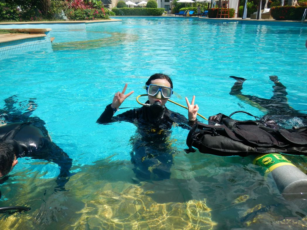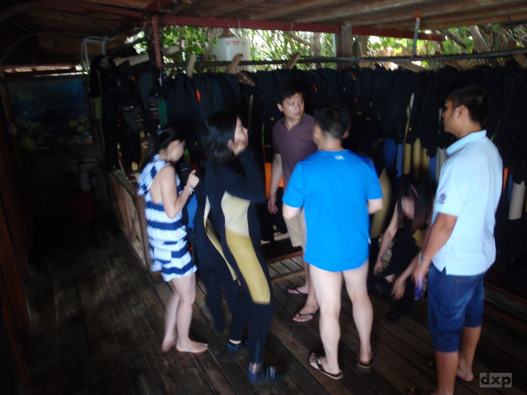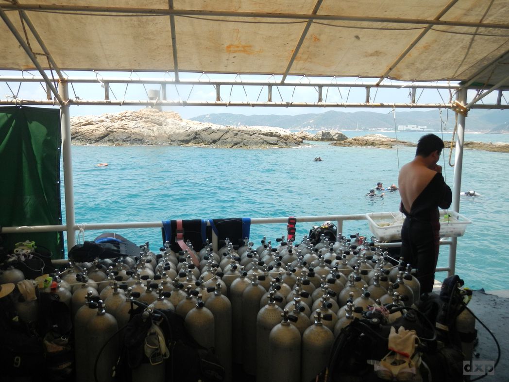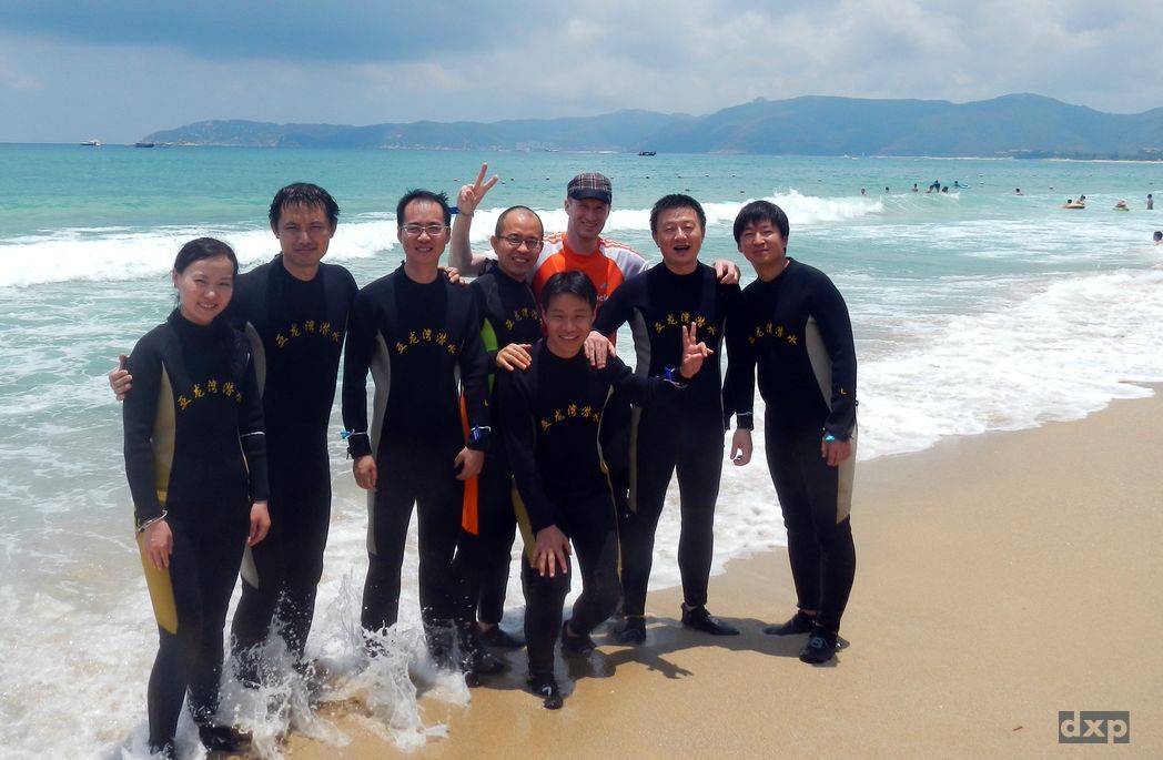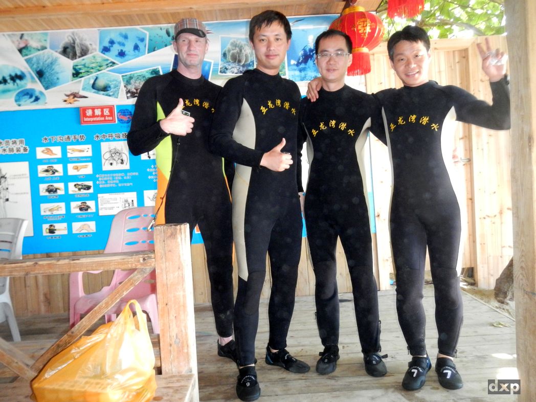 Montag ist dann Team-Building angesagt. Schnuppertauchen habe ich organisiert. Im Tauchcenter bekommen wir erst mal Neos (wegen der bitteren Kälte bei 30C im Schatten und 28C Wassertemperatur!). Gut dass es zum Pool nicht all zu weit ist. Wir bekommen Taucherbrillen und der Lehrer erklärt uns, wie das mit dem Atmen funktioniert. Als Ausländer wird mir gleich mal unterstellt, dass ich das ja alles schon kann. Nach ein paar Minuten hat jeder ein paarmal aus der Flasche geschnauft und wir werden in Richtung Boot geschickt, um zum Tauchfelsen raus zu fahren. Unsere Kameras dürfen wir nicht mit nehmen, bzw. Müssen 100 RMB Fotolizenz zahlen.