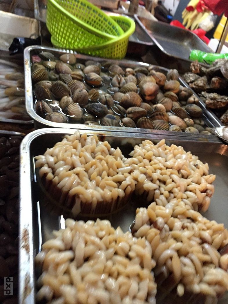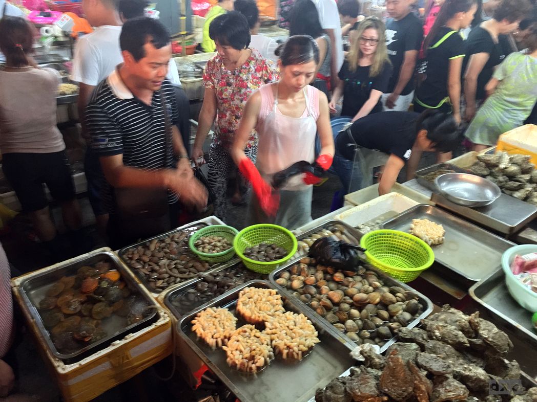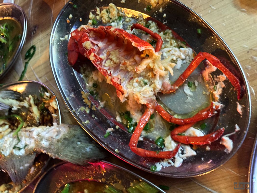 Wir machen uns auf den Weg in die Stadt. Auf einem Fischmarkt kaufen wir frischen Fisch, Muscheln und anderes glibberiges Zeug. Mit der Beute in Plastiktüten schlendern wir durch einen kleinen Markt mit einigen Straßen Restaurants. Die Fische sind so frisch, die sind gar nicht richtig tot und zappeln in den Tüten. An einem Restaurant lassen wir unsere Fische zubereiten, erst nach dem verhandelt wurde und auch der Bierpreis zufriedenstellend ist. Und ich muss sagen, der Fisch war super gut. Die Lobster noch besser. Es ist laut, Trubel um uns, 30C warm und schwül. Aber das Ambiente passt so gut, dass es einfach super Spaß macht.